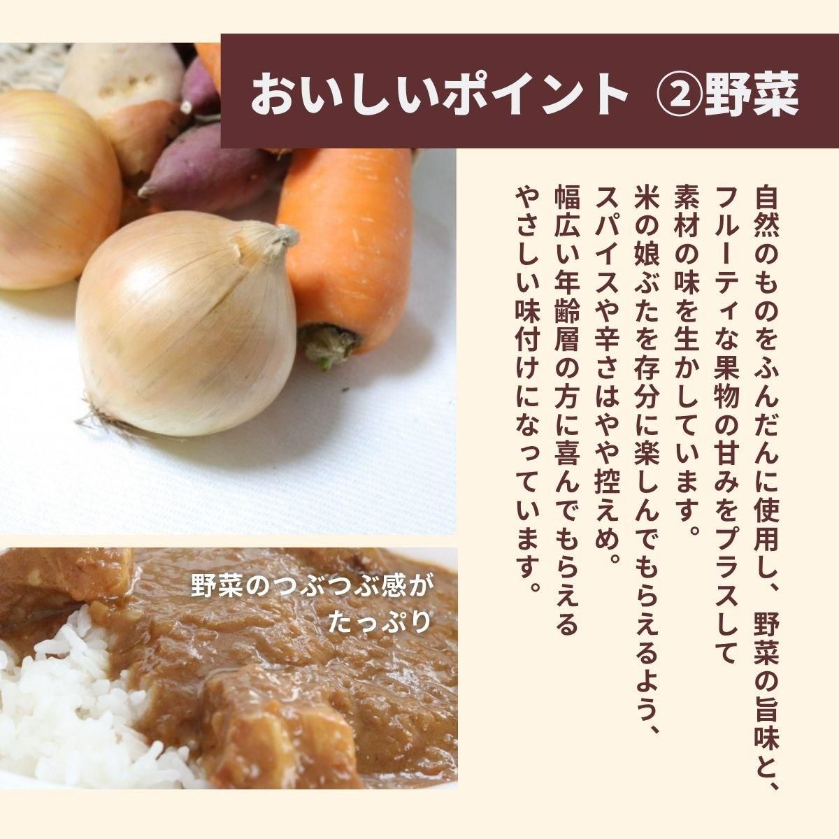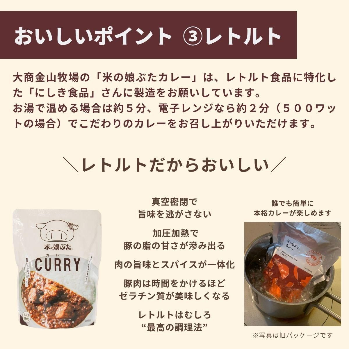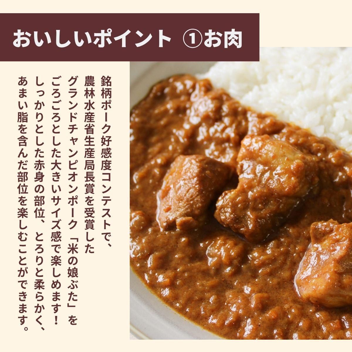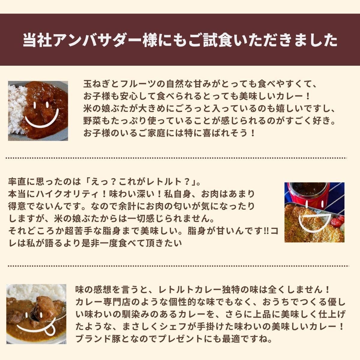 | 原材料 | 炒めたまねぎ(国内製造)、豚肉、炒めにんじん、りんごピューレー、なたね油、バナナピューレー、ココナッツミルクパウダー、チキンエキス調味料、ミルポワペースト、トマトペースト、カレー粉、ビーフエキス調味料、砂糖、でん粉、にんにく、おろししょうが、食塩、香辛料、酵母エキス、ガラムマサラ、(一部に乳成分・小麦・牛肉・大豆・鶏肉・バナナ・豚肉・りんごを含む) |