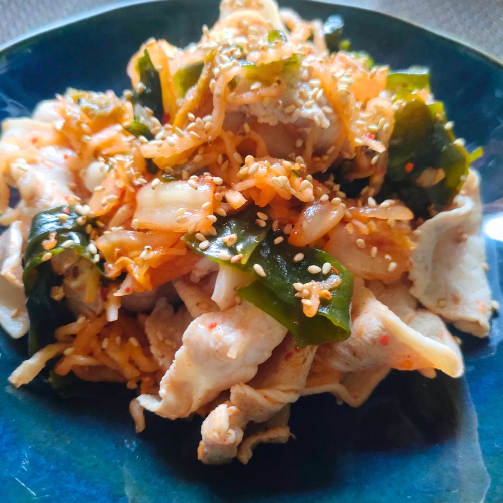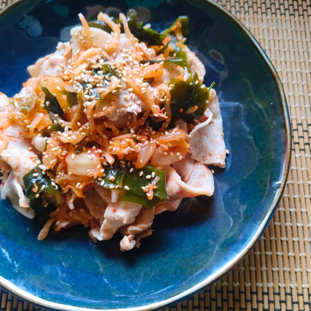 発酵食品であるキムチ、食物繊維が豊富な切り干し大根とわかめ、そして体を支える良質なたんぱく質の豚肉。